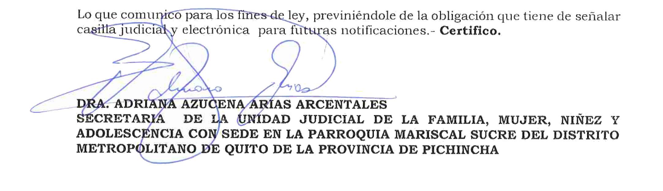 Lo que comunico a Ud., para los fines legales pertinentes, previniéndole con la obligación de señalar casillero judicial en la ciudad de Quito, para sus futuras notificaciones.
