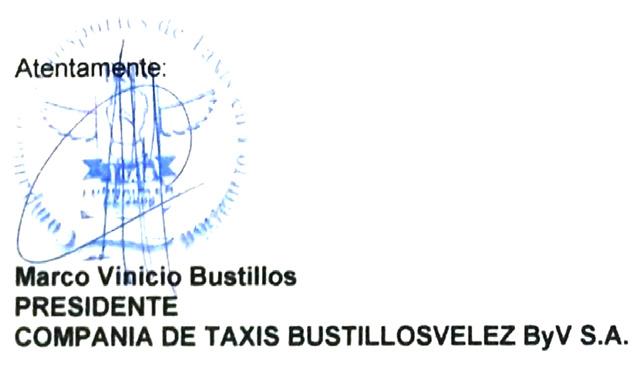 El señor Marco Bustillos en calidad de PRESIDENTE de la COMPAÑIA DE TAXIS BUSTILLOSVELEZ ByV S.A. procede a convocar a una Junta General Ordinaria de Socios y/o Accionistas a desarrollarse el día: