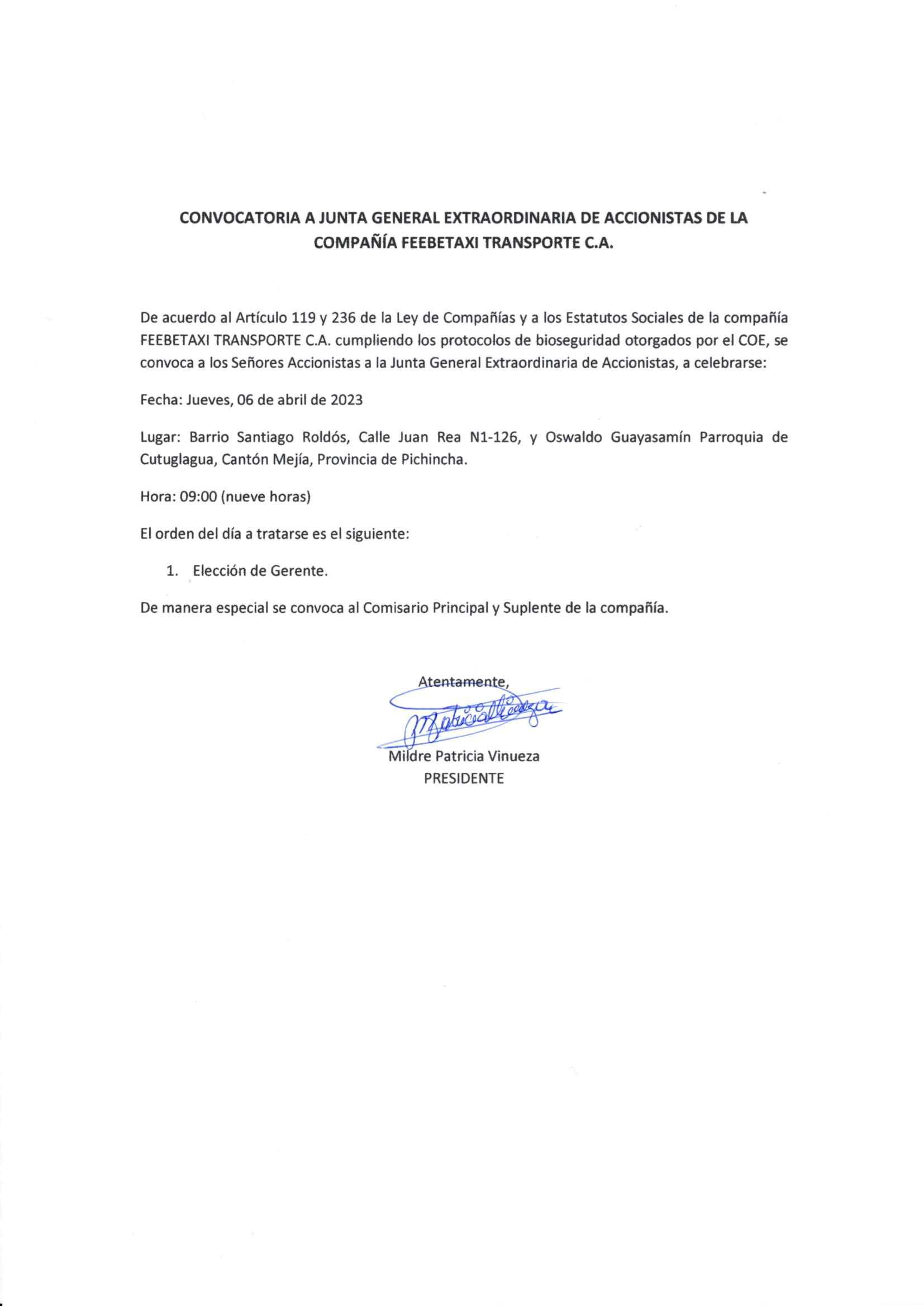 Se convoca a los señores accionistas de la compañía a la Junta General Ordinaria, el día sábado 1 de Abril del 2023, a las 10:00 horas, en primera convocatoria, en el domicilio social, calle S45B N° Oe3-28 y Quitumbe Ñan (Cdla del Ejercito), para tratar el siguiente: