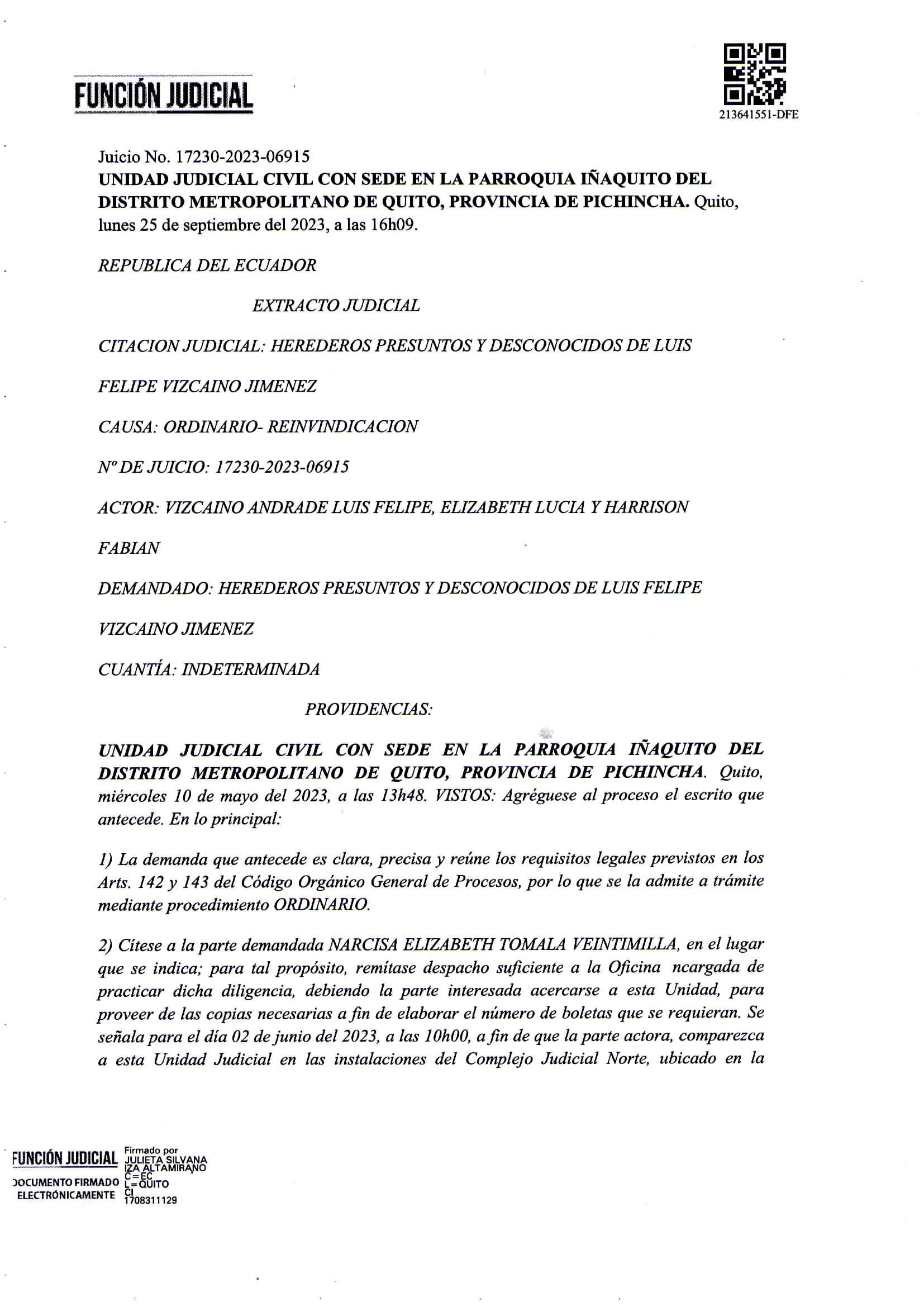UNIDAD JUDICIAL CIVIL CON SEDE EN LA PARROQUIA IÑAQUITO DEL DISTRITO METROPOLITANO DE QUITO, PROVINCIA DE PICHINCHA. Quito, miércoles 21 de junio del 2023, a las 10h33. Incorpórese al expediente el escrito que antecede. En atención al mismo: Se convalida la providencia inmediata anterior, de conformidad a lo previsto en el artículo 169 de la Constitución de la República del Ecuador y en el artículo 130 numeral 8 del Código Orgánico de la Función Judicial, en el sentido que se cite a los herederos presuntos y desconocidos del señor