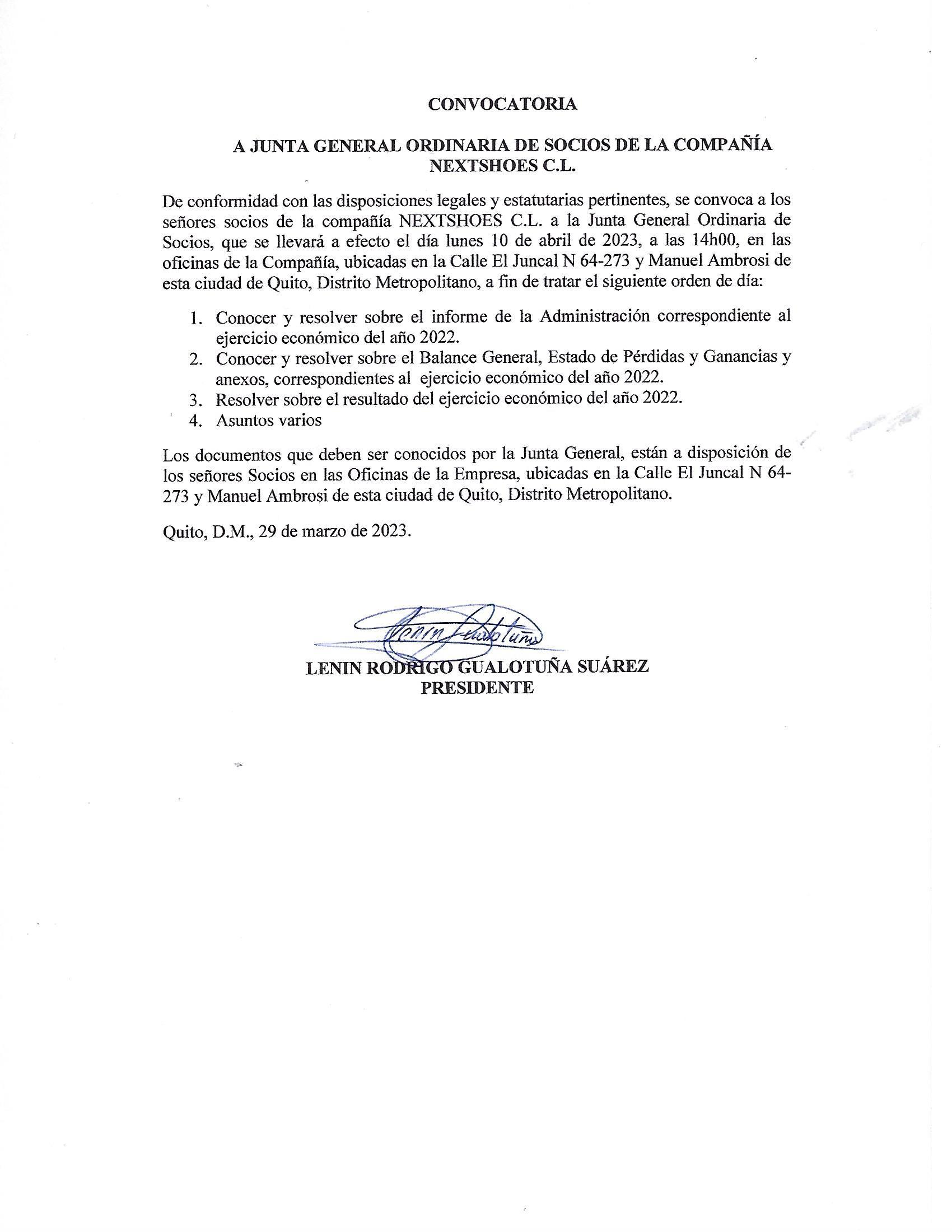 A JUNTA GENERAL ORDINARIA DE SOCIOS DE LA COMPAÑÍA NEXTSHOES C.L.