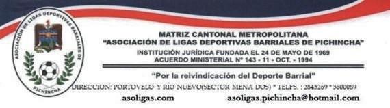 La Matriz Cantonal Asociación de Ligas Deportivas Barriales de Pichincha (Asoligas), con Acuerdo Ministerial N°143 de fecha 11 de octubre del 1994, amparados en los Artículos 151 y 153 de la Ley del Deporte, Educación Física y Recreación vigente; Artículos 15,16,18,19 y 73 del Reglamento Sustitutivo al Reglamento General de la Ley del Deporte, Educación Física y Recreación y Artículos 23 literal b),24 y 25 del Estatuto de Asoligas, realiza la presente CONVOCATORIA, a la Asamblea de elecciones del nuevo Directorio para el periodo 2023-2027, a llevarse a cabo el día miércoles 16 de agosto del presente año a partir de las 19h00 (7:00 p.m.), en la sede social de Asoligas ubicada en las calles Portovelo y Río Nuevo, Barrio Combatientes del 41, Sector Mena 2 Particular que ponemos en su conocimiento para los fines consiguientes.