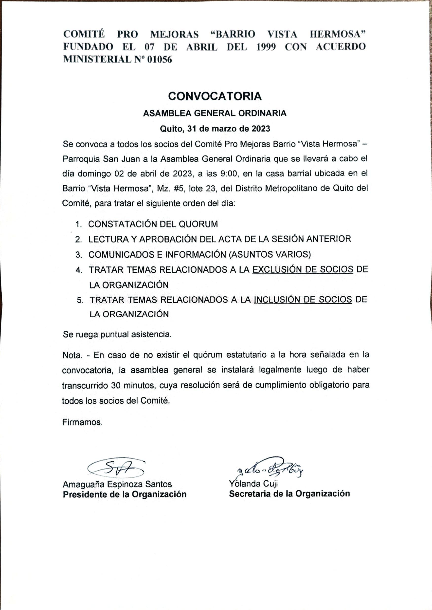 Se convoca a los señores socios de la empresa INGENIERIA Y EQUIPOS ASOCIADOS CIA. LTDA. - INIEQA, a la Junta General Extraordinaria que tendrá lugar el día 14 de ABRIL de 2023, a las 12h00, la misma que se desarrollará de manera virtual considerando la eficiencia administrativa que implica la sesión virtual y la necesidad de mantener distanciamiento en la medida de lo posible por eventuales rebrotes de COVID 19, por lo cual, la reunión convocada se realizará mediante la plataforma ZOOM, con los siguientes datos de acceso para la respectiva videoconferencia: