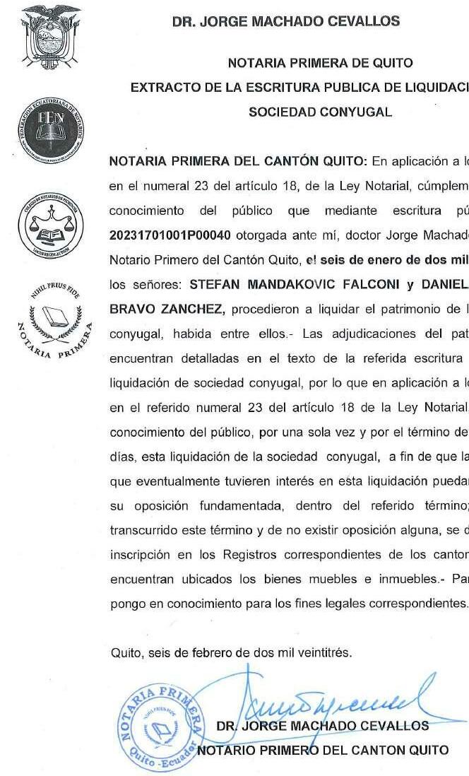 NOTARÍA OCTAVA DEL CANTÓN IBARRA: Cúmpleme poner en conocimiento del público que mediante escritura otorgada en la Notaría Octava del cantón Ibarra, el cinco de diciembre del dos mil veintidós, los señores PEDRO FRANCISCO TULCÁN ARTEAGA y JOSÉ LUIS EGAS TORO, procedieron a la constitución de la sociedad civil denominada “INDUTE S.C.C”, de conformidad con el numeral veintinueve del artículo dieciocho de la Ley Notarial, se dispone la publicación del extracto, por una sola vez en uno de los periódicos de mayor circulación en el domicilio de la sociedad civil, previa su aprobación e inscripción en el Registro Mercantil.