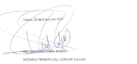 Se pone en conocimiento del público en general y para los fnes legales consiguientes que en la Notaría Pública Primera del Cantón Tulcán se ha procedido a suscribir con fecha veintiuno de Mayo de mil novecientos noventa y ocho, la escritura pública de Compra Venta bajo el Protocolo Número 575, CUANTIA ( SI 300.000) celebrada ante el señor Wilson Bravo Mejía, Notario Primero del Cantón Tulcán, otorgada por los cónyuges señores VICENTE ARQUIMEDES AYALA CHAPUES y LUZ CARMELA MONTENEGRO VALENZUELA, en calidad de Vendedores y de otra parte el señor LUIS MARCELO POZO, en calidad de Comprador, de un lote de terreno signado con el número UNO, que se desmembra de otro de mayor superfcie ubicado en la Parroquia Santa Martha de Cuba, Cantón Tulcán, Provincia del Carchi, que tiene lo siguientes linderos: NORTE, con la propiedad del señor Israel Ayala en una extensión de diecisiete metros; SUR, con la calle “Velasco Ibarra” en una extensión de catorce metros; ESTE, con la propiedad que se reservan los vendedores, en una extensión de dieciséis metros; y, OESTE, en una extensión de trece metros con la calle sin nombre.- Con una extensión de DOSCIENTOS SETENTA METROS CUADRADOS, Instrumento público que hasta la presente fecha no se la ha hecho inscribir, por lo que se procede hacer la Reliquidación de la misma, de conformidad al Artículo (709) del Código Civil y Artículo (29) de la Ley de Registro