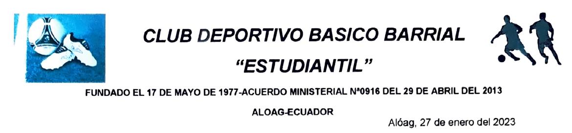 se convoca a los señores socios del CLUB DEPORTIVO BASICO BARRIAL “ESTUDIANTIL” a la Asamblea General extraordinaria de Elecciones, que se celebrara el día Lunes 20 de febrero del 2023 a partir de las 20 horas en la dirección Parroquia