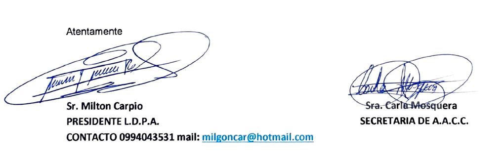 En el caso de no contar con el Quórum reglamentario la sesión se instalará una hora más tarde con el número de accionistas presentes. Se convoca de manera especial al Sr. LUIS DELGADO comisario de la compañía. Muy Atentamente