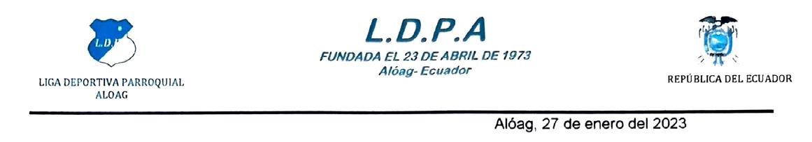 De conformidad con las disposiciones estatutarias del acuerdo Ministerial No MDZZ2-2016-0818 SE CONVOCA A TODOS LOS CLUBS FILIALES A LIGA DEPORTIVA PARROQUIAL ALÓAG a la Asamblea General extraordinaria de Elecciones, que se celebrara el día Miércoles 15 de febrero del 2023 a partir de las 19 horas (7p.m.) en el local de sesiones de nuestra Institución ubicado en la panamericana sur Km 2 y ½ vía a Sto. Domingo de los Tsáchilas y calle s/n para tratar el siguiente orden del día: