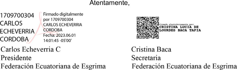 La Federación Ecuatoriana de Esgrima , convoca a los Clubes Deportivos Especializados de Alto Rendimiento y Formativos de la Federación Ecuatoriana de Esgrima a la ASAMBLEA GENERAL EXTRAORDINARIA a realizarse el Lunes 19 de junio de 2023, a las 18h00, en la Av. 6 de diciembre y Av. Naciones Unidas en el estadio Olímpico Atahualpa en el acceso tres en la Asociación de Esgrima de Pichincha , a fin de tratar el siguiente orden del día: