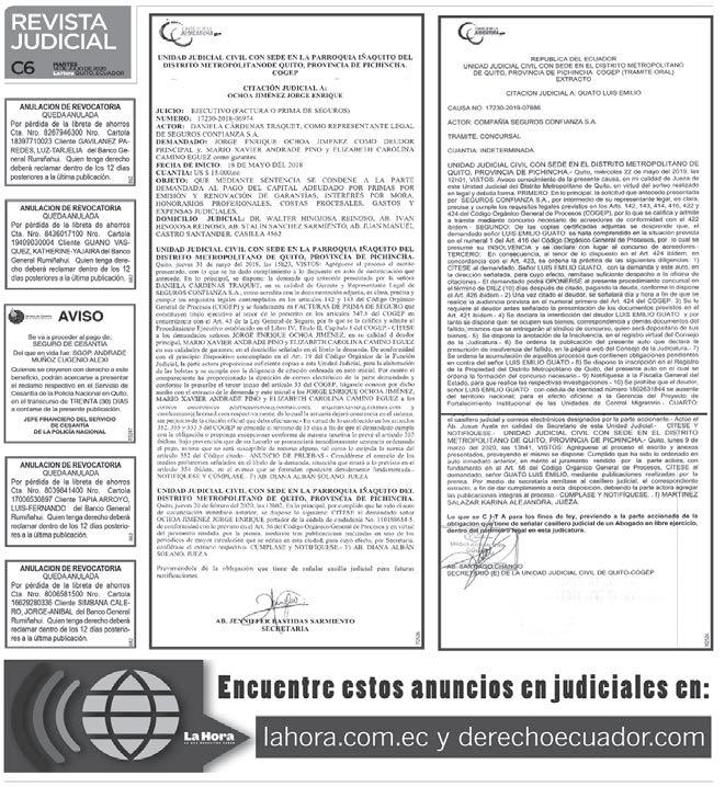 JUZGADO VIGÉSIMO DE LO CIVIL DE PICHINCHA. Quito, 3 de Mayo del 2.005; Las 09h00.- VISTOS.-En virtud del sorteo realizado y en mi calidad de Juez Titular de esta Judicatura, avoco conocimiento de la presente causa. En lo principal, la demanda que antecede es clara, precisa y reúne los requisitos de Ley, por lo que se la acepta a trámite EJECUTIVO.- En consecuencia, cumplan con la obligación demandada o propongan excepciones en el término legal de TRES días la demandados GUILLERMO ANTONIO MALDONADO ALVAREZ y TRANSITO DEL PILAR ANALUISA PURUNCAJAS.- Por solicitarlo el actor, en mérito al certificado del Registro de la Propiedad y de conformidad con lo que dispone el artículo 431, Inciso 2do. Del Código de Procedimiento Civil, ordenase la prohibición de enajenar del 50% de los Derechos y acciones a los que tenga derecho la señora TRANSITO DEL PILAR ANALUISA PURUNCAJAS en el inmueble, cuyas características y demás especificaciones constan en el certificado del Registro de la Propiedad se acompaña y que es de propiedad d la demandada.- Para la práctica de esta diligencia se notifica al señor Registrador de la propiedad de este Cantón. Hecho que sea cítese a los demandados en el lugar indicado para tal efecto.- Agréguense al proceso los documentos presentados.- Téngase en cuenta el casillero y domicilio judicial los documentos presentados.- Téngase en cuenta el casillero y domicilio judicial designado por el acto para sus posteriores notificacio- nes.- Notifíquese.- DR. GERMÁN GONZÁLEZ DEL POZO, JUEZ.