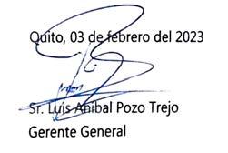De conformidad con la ley de Compañías y los Estatutos de la Cía. se convoca a los Señores Accionistas, A LA JUNTA GENERAL UNIVERSAL ORDINARIA por el Ejercicio Económico 2022 que se efectuará el día 20 de Febrero del 2023 a las 08:00 en las oficinas de la Empresa, ubicada en la Av. Jose Andrade Oe1-281 y Juan de Selis, Quito-Ecuador.