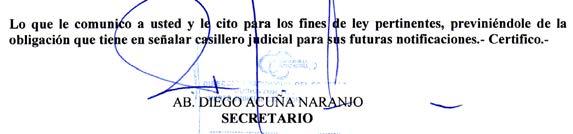 Particular que llevo a su conocimiento para los fines legales pertinentes, advirtiéndole de la obligación que tiene de señalar casillero judicial en esta ciudad de Quito para sus posteriores notificaciones.