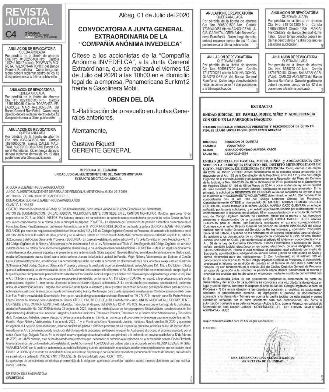 Dentro del Juicio Rendición de Cuentas No. 09332-2014-32659, que sigue: PADILLA CASTRO VICTOR HUGO Contra: JORGE ENRIQUE SAMANIEGO, en calidad de Gerente General y Representante Legal de la Compañía SUPERINMO S.A., se ha dispuesto ofciar a usted con el fn de hacerle saber lo siguiente: UNIDAD JUDICIAL CIVIL CON SEDE EN EL CANTÓN GUAYAQUIL DE GUAYAS. Guayaquil, lunes 1 de julio del 2019, las 08h33. VISTOS: Por ser el estado de la causa el de resolver en mérito del auto que antecede y para hacerlo se considera. PRIMERO: De fojas 29 a 30 de los autos, comparece el señor VICTOR HUGO PADILLA CASTRO, por sus propios y per sonales derechos demandando al señor JORGE ENRIQUE SAMANIEGO, en calidad de Gerente General y Representante legal de la Compañía SUPERINMO S.A., con la fnalidad de que ejecute el mandato de lo establecido el Art. 198 de la Compañía a se permita proceder de esa forma, así como el pago de la indemnización de la mora. La vía por la cual deberá tramitarse la vía es la Ordinaria. Fundamenta su pretensión en base a lo dispuesto en el artículo 189 de la Ley de Compañías, el Art. 59 del Código de Procedimiento Civil y el articulo 1589 del Código Civil. A fojas 37 del proceso, se califca la demanda y por reunir los requisitos de Ley se la admite a trámite de Juicio Ordinario, ordenándose citar al demandado para que en el término de quince días propongan excepciones permitidas por la Ley. Consta a foja 41 del proceso la razón de imposibilidad de citación al demandado de fecha 14 de Octubre del 2011. Mediante providencia de fecha 2 de Diciembre del 2011, a las 15h00, se ordenó citar al demandado en la dirección indicad por el actor del proceso. A foja 46 del proceso, consta la diligencia de citación personal al demandado JORGE ENRIQUE SAMANIEGO, en calidad de Gerente General y Representante legal de la Compañía SUPERINMO S.A, de fecha 9 de Febrero del 2012, por el citador judicial Malcolm León. Mediante escrito de fecha 8 de Marzo del 2012, a las 15h28, comparece el demandado JORGE ENRIQUE SAMANIEGO, por sus propios derechos y por los derechos que representa de la Compañía SUPERINMO S.A., en calidad de Gerente General y Representante legal. Mediante providencia de fecha 21 de Abril del 2012, a las 11h36, el señor juez antecesor de la causa ordenó que por secretaria se siente razón si el demandado compareció a juicio presentando excepciones dentro del término de ley, razón que obra a fojas 52 vuelta, donde se certifca que la compañía demandada no ha presentado excepciones dentro del término concebido. Mediante Providencia de fecha 9 de Julio del 2012, a las 14h55, se dispuso convocar a las partes a la correspondiente Junta de Conciliación, para el día 30 de Julio del 2012, a las 11h10, cuya acta obra foja 64, con la comparecencia de las partes procesales, quienes en dicha diligencia conciliaron con la fnalidad de dar por terminado el proceso. Mediante providencia de fecha 9 de noviembre del 2012, a las 11h33, de conformidad con el acuerdo que arribaron las partes en la Junta de Conciliación realizada, se dio termino de 72 horas para que cumplan con lo convenido en dicha diligencia procesal. Mediante providencia de fecha 11 de enero del 2013, a las 15h36, el juez antecesor de la causa ordenó ofciar a la Superintendencia de Compañías de Guaya quil a fn de que designe a un funcionario quien deberá verifcar en los libros de la Compañía SUPERINMO S.A., si se ha inscrito en el libro respectivo la transferencia de propiedad de las acciones a favor del Sr. Víctor Hugo Padilla Castro, así mismo indique a ésta judicatura si está transferencia fue notifcada en legal y en debida forma a la Superintendencia de Compañías, cuya contestación por parte de la Superintendencia de Compañías obra a fojas 85 y 86 del proceso. Mediante providencia de fecha 1 de Agosto del 2014, a las 11h40, se ordenó continuar con la causa, aperturandose la causa a prueba por el termino de días. Mediante providencia de fecha 14 de Agosto del 2014, a las 14h31, se atendió el escrito de prueba presentado por la parte actora de fecha 13 de Agosto del 2014, a las 15h08. Medi ante providencia de fecha 15 de Agosto del 2014, a las 15h31, se atendió el escrito presentado por el señor JORGE ENRIQUE SAMANIEGO, de fecha 15 de Agosto del 2014, a las 10h40. A foja 132 consta la diligencia de Confesión Judicial efectuada al demandado JORGE ENRIQUE SAMANIEGO. Mediante auto de fecha 28 de Junio del 2016, a las 18h21, este juzgador avoca conocimiento de la causa. Mediante providencia de fecha 4 de Octubre del 2016, a las 08h53, se dispuso ofciar a la Superintendencia de Compañías con sede en el Cantón Guayaquil, a fn de que remita información necesaria a este despacho con la fnalidad de esclarecer la verdad procesal. Mediante providencia de fecha 16 de Junio del 2017, a las 10h34, se dispuso a las partes procesales que indiquen si los medios de prueba solicitados dentro del término de prueba han sido evacuados. Mediante providencia de fecha 5 de Septiembre del 2017, a las 15h01, se declaró concluido el termino de prueba y en su 104964316-DFE defecto que pasen los autos para dictar sentencia. Mediante decreto de fecha 1 de Marzo del 2018, a las 08h13, se dispuso declarar la nulidad de todo lo actuado a partir de la providencia de fecha 13 de Agosto del 2012, a las 15h44, quedando al estado de dictar sentencia de aprobación de acuerdo total llegado entre las partes en la Junta de Conciliación realizada a fecha 30 de Julio del 2012. Mediante decreto de fecha 24 de Junio del 2019, a las 12h37, se dispuso que pasen los autos para resolver. SEGUNDO: El suscrito Juez de lo Civil de la Unidad Judicial Florida Norte de Guayaquil es competente para conocer, sustanciar y resolver el presente proceso en virtud de la Acción de Personal No. 8519DNTH2015SC, y de conformidad a lo señalado en los Arts. 167; 172; y 226 de la Constitución de la República del Ecuador, 150; 156; 239 