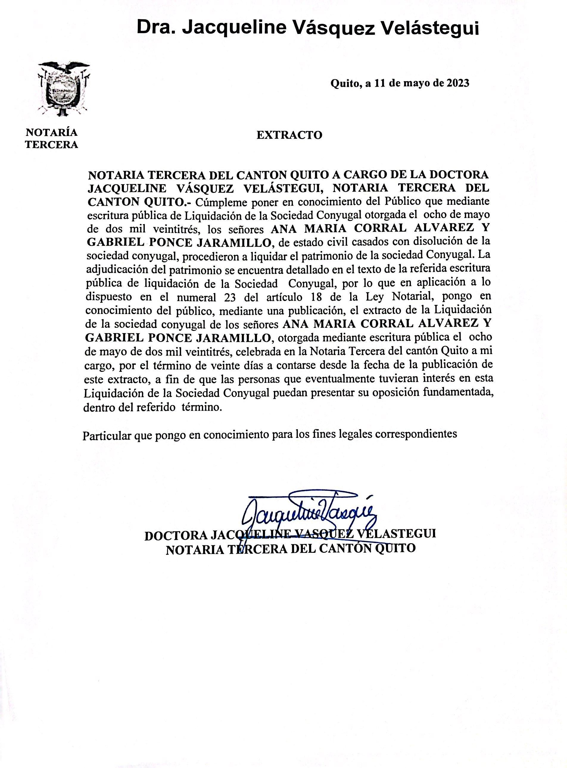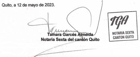 NOTARIA SEXTA DEL CANTON QUITO: Cúmpleme poner en conocimiento público que mediante escritura pública celebrada ante mi Tamara Garcés Almeida, Notaria Sexta del cantón Quito, el doce de mayo de 2023, se realizó la REFORMA DEL ESTATUTO SOCIAL