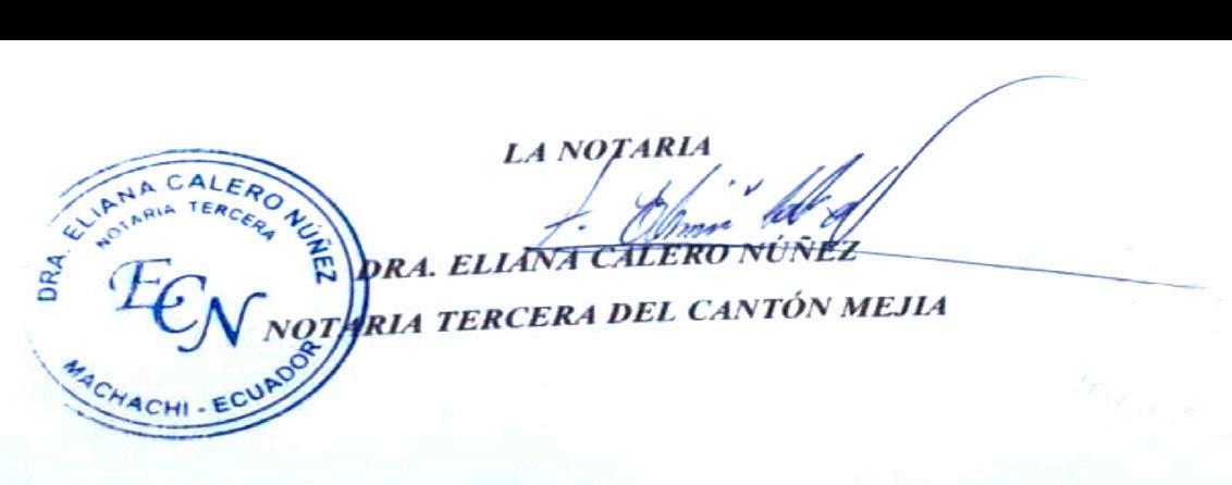 NOTARÍA TERCERA DEL CANTÓN MEJIA: Cúmpleme poner en conocimiento del público en general, que, mediante escritura pública otorgada ante la Doctora Eliana Calero Núñez, Notaria Pública Tercera del Cantón Mejía, el diez de Abril del dos mil veintitrés, con número de protocolo 20231703003P0032 1; Los cónyuges señores JOSE MANUEL CHILIG BAUTISTA, de estado Civil casado; y la señora MARIA ROSARIO
