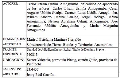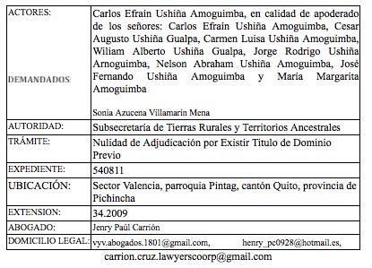 ADJUDICADO, signado con el Nro. 540811, presentada por el señor Carlos Efraín Ushiña Amoguimba, en calidad de apoderado de los señores: Carlos Efraín Ushiña Amoguimba, Cesar Augusto Ushiña Gualpa, Carmen Luisa Ushiña Amoguimba, Wiliam Alberto Ushiña Gualpa, Jorge Rodrigo Ushiña Amoguimba, Nelson Abraham Ushiña Amoguimba, José Fernando Ushiña Amoguimba y María Margarita Amoguimba; en contra de la señora Sonia Azucena Villamarin Mena; sobre un predio con una superficie de 34. ubicado en el sector Valencia, parroquia Pintag, cantón Quito, provincia de Pichincha, se ha dictado el siguiente acto administrativo:
