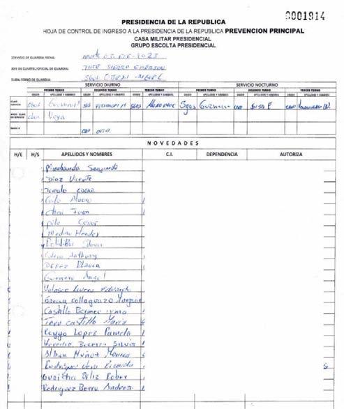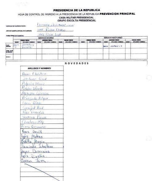 La documentación entregada por la Casa Militar está en dos archivos digitales con más de 1.300 páginas escaneadas; con su respaldo físico en dos carpetas Bene. En estas se puede observar la imagen de cada hoja del registro de visitas por la prevención principal de Carondelet, como también el registro de extranjeros, desde el 24 de mayo de 2021 hasta la fecha de solicitud.