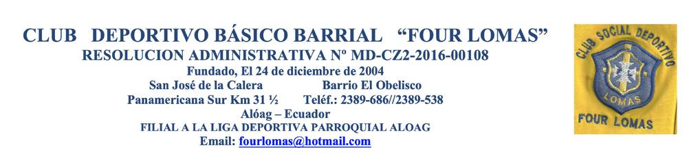 De conformidad con las disposiciones estatutarias del acuerdo Ministerial No MDZ-Z2-2016-08-18 se convoca a los señores socios del CLUB DEPORTIVO BASICO BARRIAL “FOUR LOMAS” a la Asamblea General extraordinaria de Elecciones, que se celebrara el día Domingo 4 de Junio del 2023 a partir de las 20 horas en la dirección Parroquia Alóag Cantón Mejía Barrio el Obelisco y San José de la Calera para tratar el siguiente orden del día: