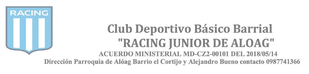 De conformidad con las disposiciones estatutarias del acuerdo Ministerial No MDZ-Z2-2016-08-18 se convoca a los señores socios del CLUB DEPORTIVO BASICO BARRIAL “RACING JUNIOR DE ALOAG” a la Asamblea General extraordinaria de Elecciones, que se celebrara el día Lunes 5 de Junio del 2023 a partir de las 20 horas en la dirección Parroquia Alóag Cantón Mejía barrio El Cortijo y Alejandro Bueno para tratar el siguiente orden del día: