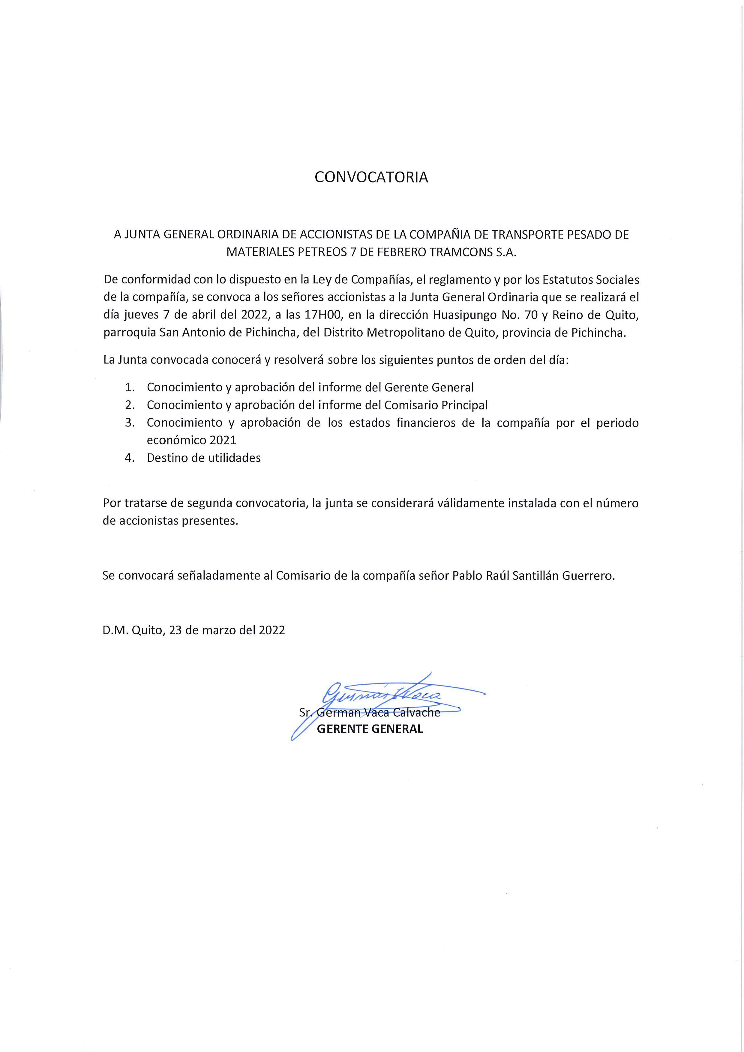 De conformidad con lo dispuesto en la Ley y en el Estatuto Social, en calidad de administradores de la empresa, convocamos a los señores accionistas a la Junta General Ordinaria a llevarse a cabo el día 29 de octubre del 2022, a las 08:30am en la sede de la Empresa, ubicada en la parroquia de Cusubamba, Barrio Rosalía, Calle Enriqueta Bustamante y pasaje B, en el que se tratara el siguiente orden del día: