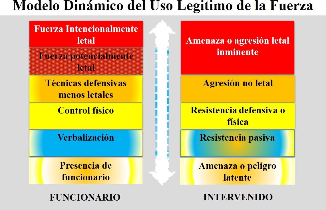 Es decir, los niveles deben ser aplicados de manera dinámica y combinada, los cuales pueden va riar de acuerdo a la actitud, con ducta y comportamiento del o los intervenidos, y de acuerdo al nivel de cooperación, resistencia o agre sión, por lo que, se puede obviar niveles intermedios si la acción de resistencia o agresividad del o los intervenidos se eleva o disminuye drásticamente.