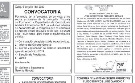 Se convoca a los señores copropietarios de la Plaza de Toros de Santiago de Guayaquil, declarado bajo el régimen de propiedad horizontal, a la Asamblea General Extraordinaria que se realizará el día 11 de Octubre de 2022 desde las 10:00, en la sala de sesiones de las oficinas ubicadas en la Avenida Jorge Pérez Concha No. 201, y Calle Única, Urdesa, de la ciudad de Guayaquil.
