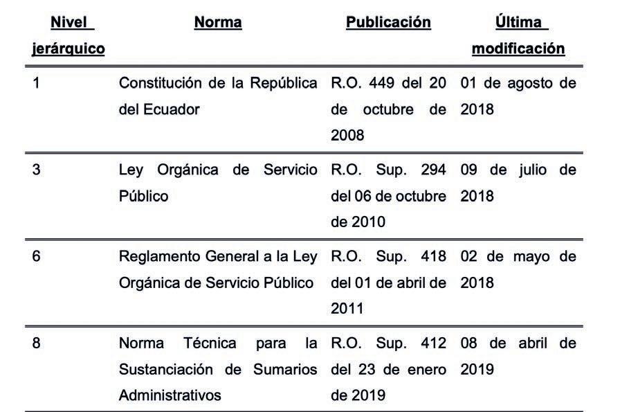 Pero sobre todo estaría al descubierto que las autoridades administrativas, como lo son los sustanciadores de los sumarios administrativos, no resuelven el conflicto entre normas de distinta jerarquía por medio de la aplicación de la norma jerárquica superior como manda el tenor literal del artículo 425 de la CRE, inciso 2, y que por tanto el servidor que se considere afectado debe recurrir a una instancia judicial para que se resarzan sus derechos vulnerados.
