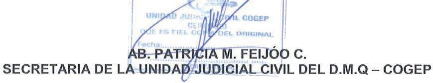SE HA DISPUESTO LA PRACTICA DE LA SIGUIENTE DILIGENCIA DENTRO DEL JUICIO 17230-202010343.- UNIDAD JUDICIAL CIVIL CON SEDE EN EL DISTRITO METROPOLITANO DE QUITO, PROVINCIA DE PICHINCHA.- Quito, lunes 26 de octubre del 2020, a las 10h23. VISTOS: Avoco conocimiento de la presente causa en mi calidad de Juez Encargado de la Unidad Judicial de lo Civil con sede en el Distrito Metropolitano de Quito, Provincia de Pichincha, mediante acción de personal Nro. 4962-DP17-2018-MP del 5 de junio del 2018.- PRIMERO: Por cuanto la demanda presentada cumple con los requisitos previstos en los artículos 142, 143 del Código Orgánico General de Procesos (COGEP); y, por cuanto el Laudo Arbitral, constituye título de ejecución, de conformidad al Art. 363 numeral 2; en tal virtud se admite a trámite mediante procedimiento de ejecución. SEGUNDO: Por no haber convenido el pago de interés y costas en caso de incumplimiento del mandamiento de ejecución, procede emitir el mandamiento de ejecución: MANDAMIENTO DE EJECUCIÓN.- De conformidad con el Art. 372 del Código Orgánico General de Procesos se dicta mandamiento de ejecución en los siguientes términos: (2.1).- IDENTIFICACIÓN DE LA PARTE EJECUTADA que debe cumplir con la obligación, son los señores JAIME OSWALDO RIVERA CEVALLOS y JENNY YOLANDA MOLINA LEÓN.(2.2).- ORDEN DE CUMPLIR CON LAS OBLIGACIONES: Los ejecutados JAIME OSWALDO RIVERA CEVALLOS y JENNY YOLANDA MOLINA LEÓN, por sus propios derechos, en la forma y calidad que han sido demandados cumplan con las siguientes obligaciones que se proceden a cumplir las obligaciones adquiridas con el ejecutante ROBERTO NICOLÁS MONCAYO PINO, las cuales se detallan a continuación: OBLIGACIONES DE HACER: 1.- Procedan con la SUSCRIPCIÓN de las escrituras de compraventa en favor del ejecutante, respecto de los siguientes bienes inmuebles: Departamento 2B con un área aproximada de setenta y nueve punto treinta y tres metros cuadraos, Bodegas número 19 y 24; y, parqueadero número 27 que forman parte del edificio “MALENA”, ubicado en el pasaje Gaspar Cañero y Avenida Seis de Diciembre, de la urbanización Barberis, parroquia Zambiza, cantón Quito, provincia de Pichincha”.- 2).- Deberán suscribir el formulario de liquidación del impuesto a utilidad y alcabalas del Municipio del Distrito Metropolitano de Quito y cualquier otro documento para que se 134897148-DFE perfecciones la transferencia de dominio.- Esto de acuerdo a los literales A, B y C de la cláusula SEGUNDA del Laudo.- 3) Deberán proceder con la reparación de vidrios e instalación de bomba de agua y generador eléctrico, conforme lo establecido en el numeral 2.1, literales E y F del adendum al Laudo.- OBLIGACIONES DE DAR: 4).- Deberán pagar del valor de los impuestos de utilidad y obras que se generen durante el proceso de transferencia de dominio de los inmuebles señalados, conforme lo establecido en el literal B de la cláusula SEGUNDA del Laudo.- Dada la naturaleza de las obligaciones; para el cumplimiento de las mimas, se les concede a los ejecutados el término de 30 días a partir de la notificación con este auto, bajo prevenciones legales que, de no hacerlo, se procederá a la ejecución forzosa, incluso por medio de terceras personas, a costa de los ejecutados.TERCERO.- Por tratarse de la ejecución de un título distinto a sentencia ejecutoriada, se ordena que se NOTIFIQUE, en el lugar señalado, en persona o mediante tres boletas, conforme lo previsto en los Arts. 54 y 55 del COGEP, a los ejecutados JAIME OSWALDO RIVERA CEVALLOS y JENNY YOLANDA MOLINA LEÓN, con una copia de la demanda y este auto de mandamiento de ejecución; para lo cual remítase despacho suficiente a la oficina de citaciones.- El ejecutante proporcione las copias necesarias para efectuar las boletas de la notificación dispuesta.- CUARTO.- Se deja a salvo el derecho de la parte ejecutada para oponerse de conformidad con el Art. 373 Ibídem.- Actúa como secretaria la Ab. Patricia Feijoo.- CÚMPLASE Y NOTIFÍQUESE.- UNIDAD JUDICIAL CIVIL CON SEDE EN EL DISTRITO METROPOLITANO DE QUITO, PROVINCIA DE PICHINCHA.- Quito, martes 18 de abril del 2023, a las 15h07. Vistos. En lo principal, se dispone: en mérito de la afirmación que bajo juramento ha realizado el Actor, conforme lo dispone el Art. 56 del Código Orgánico General de Proceso, Notifíquese a la parte demandada MOLINA LEON JENNY YOLANDA y RIVERA CEVALLOS JAIME OSWALDO, por la prensa en uno de los periódicos de mayor circulación de esta ciudad de Quito, mediante tres publicaciones que se harán cada una ellas en fechas diferentes, para lo cual se entregará el extracto respectivo. NOTIFÍQUESE.- UNIDAD JUDICIAL CIVIL CON SEDE EN EL DISTRITO METROPOLITANO DE QUITO, PROVINCIA DE PICHINCHA.- Quito, viernes 19 de mayo del 2023, a las 14h03. VISTOS: Incorpórese al proceso el escrito presentado por la parte accionante.- En lo principal se dispone: De conformidad a lo dispuesto en el artículo 169 de la Constitución de la República y artículo 130 numeral 8 del Código Orgánico de la Función Judicial, se reforma, en lo pertinente, el auto de sustanciación de fecha 26-10-2020, las 10h23 en el numeral (2.2) OBLIGACIONES DE HACER: 1. Departamento 2B con un área aproximada de setenta y nueve punto treinta y tres metros cuadrados, y no como se hace constar.- En todo lo demás las partes estarán sujetas a lo allí dispuesto.- Luego de la revisión de los recaudos procesales se desprende que existe un error involuntario de tipeo del extracto constante a fojas 134 del expediente, procédase a la corrección solicitada como se encuentra descrita en el escrito que antecede y remítase el extracto correspondiente, en el que se incluirá el presente auto de sustanciación.-