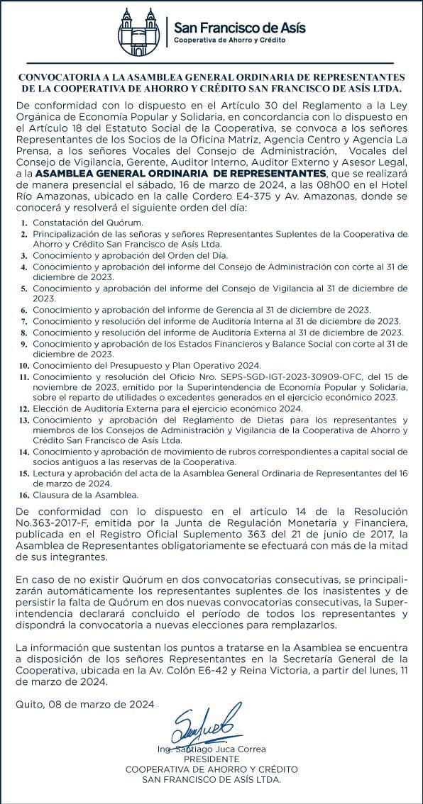 Particular que comunicamos a ustedes para los efectos pertinentes, quedando formal y reglamentariamente convocados para la Asamblea General Ordinaria. La convocatoria se realizará por la prensa.