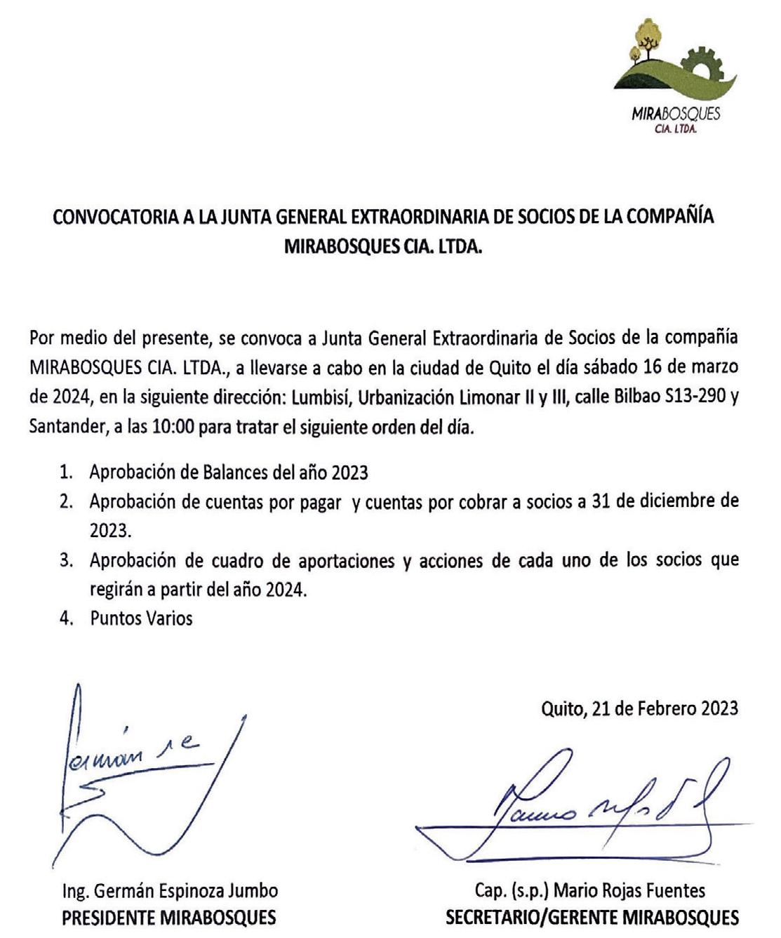 Se convoca de manera personal e individual al comisario principal de la compañía Sr. Zheizon Manolo Lara González, Dirección: Av. Jaime Roldós N85 y Agustín Cueva De no haber el Quórum reglamentario el día y la hora señalada, la junta se instalará en segunda convocatoria una hora después con el número de accionistas presentes.