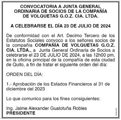 De conformidad con la Ley de Compañías, se convoca a los señores accionistas de la Compañía de Transportes. S.J. Cocotog C.A., a la Junta General Extraordinaria que tendrá lugar en las oficinas de la compañía ubicada, en las calles La Loma y las Golondrinas, Barrio San Miguel parada de buses, de esta ciudad de Quito, el día sábado 20 de julio del 2024, a las 10h00 am., para tratar el siguiente orden del día: