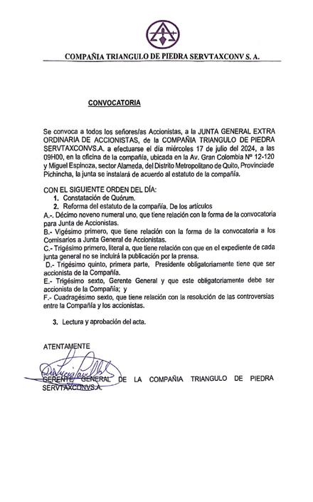 SE CONVOCA A JUNTA GENERAL EXTRAORDINARIA DE ACCIONISTAS, para el lunes 22 de julio del presente año a las 14 horas, en las oficinas de la compañía ubicada en el cantón Rumiñahui en las calles Antonio Taipe Lt 2 Y Gaspar Lema para tratar el siguiente orden del día.