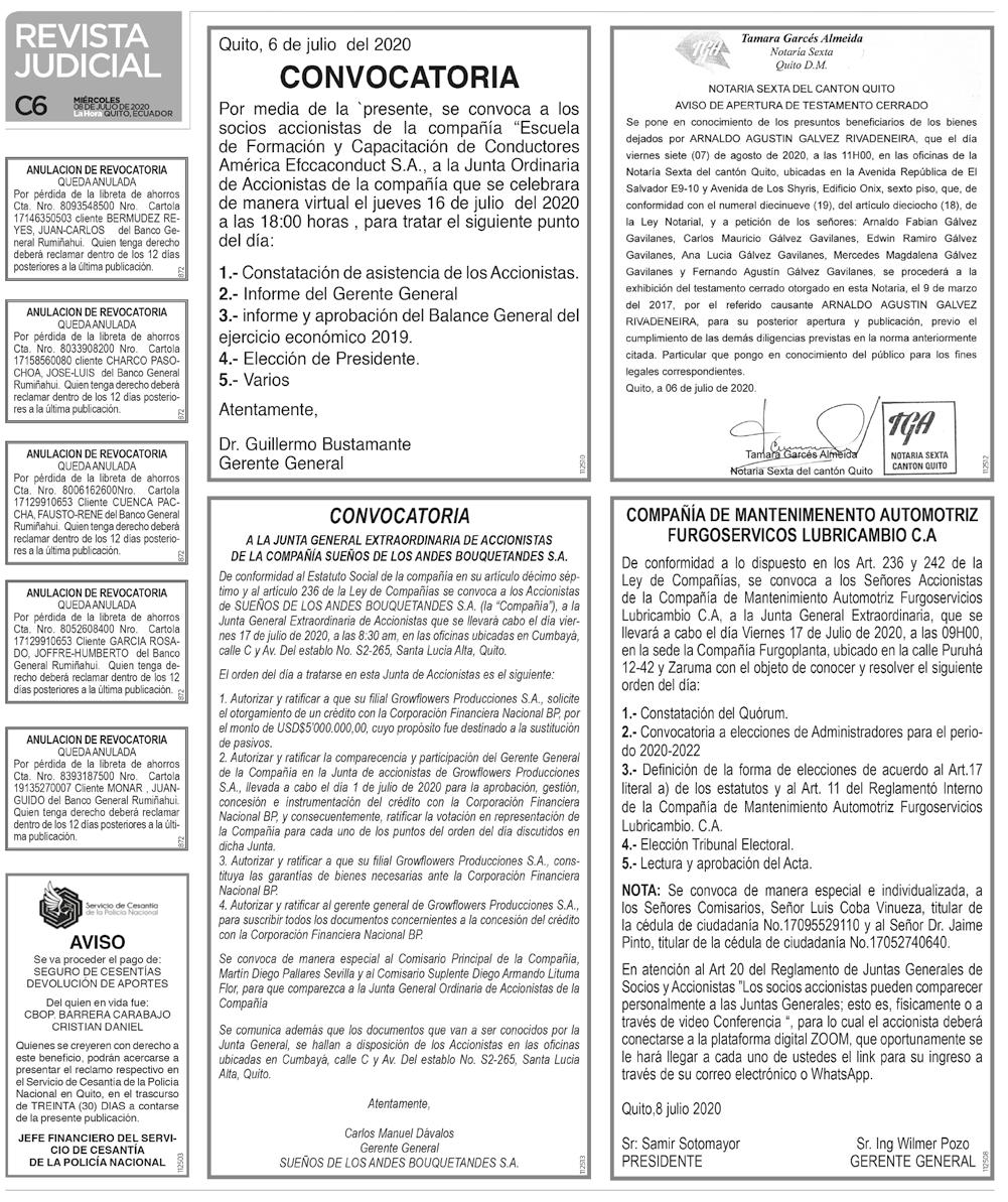 Se convoca de manera individual e independiente a la señora Norma Yambay, Comisario de la Compañía.