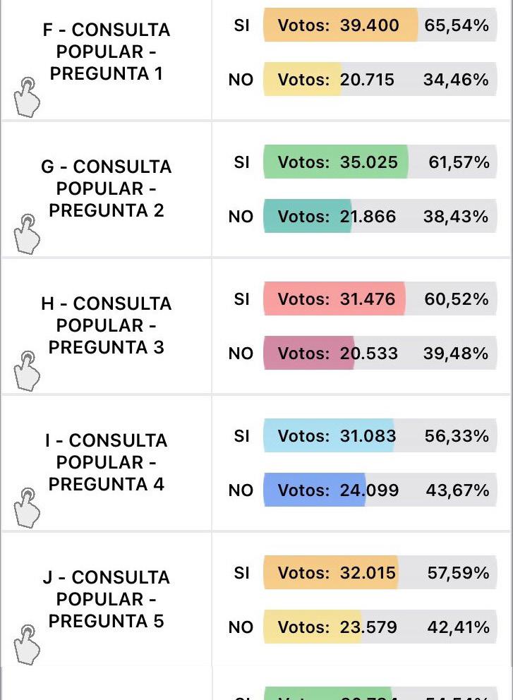 Los resultados preliminares en base a un conteo rápido (muestreo de un porcentaje de actas de escrutinio) que dio a conocer el Consejo Nacional Electoral (CNE) -cerca de las 22:00- confirmaban el triunfo a 9 de 11 de preguntas de la consulta popular y el referéndum constitucional de este 21 de abril de 2024.