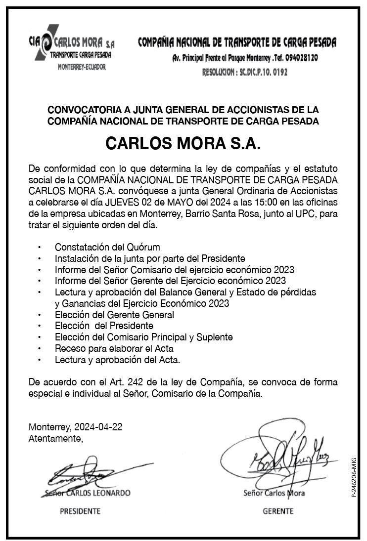 De conformidad con los Estatutos Social y la Ley de Compañías se CONVOCA a la Junta General Extraordinaria que se llevara a cabo el día dos (02) de mayo de 2023, a las 9:00 horas, en las oficinas de la compañía ubicada en la Av. 12 Octubre N2697, oficina 1402, Quito DM, en la que se tratara el siguiente orden del día: