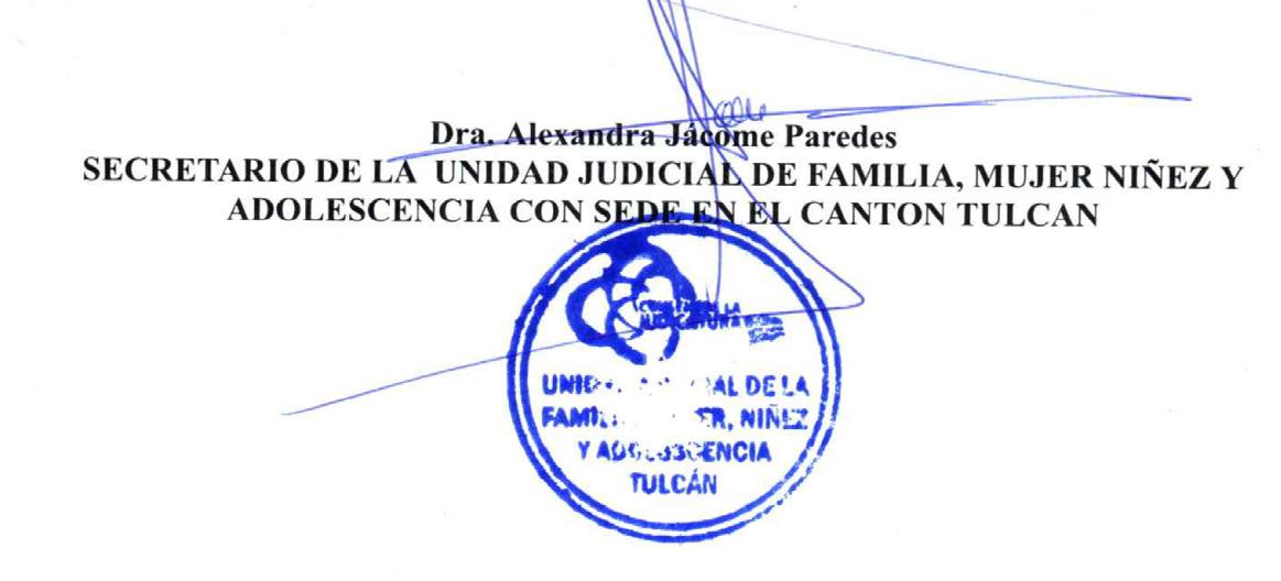 UNIDAD JUDICIAL DE LA FAMILIA, MUJER, NIÑEZ Y ADOLESCENCIA CON SEDE EN EL CANTÓN TULCÁN. Tulcán, 18 de marzo del 2024, a las 15h52. VISTOS: Avoco conocimiento de la presente causa, en mi calidad de Juez de la Unidad Judicial de la Familia, Mujer, Niñez y Adolescencia, conforme a la acción de personal No.2403-DNTH-2016 de fecha 3 de junio del 2016 suscrita por la Ing. Maria Cristina Lemarie Acosta, Directora Nacional de Talento Humando (E) del Consejo de la Judicatura, asumiendo competencias previstas en los arts. 233 y 234 del Código Orgánico de la Función Judicial.- En lo principal, se dispone: de acuerdo con el Art. 56 numeral 2 inciso segundo del Código Orgánico General de Procesos, con el objeto garantizar el debido proceso, comparezca la peticionaria a la Sala de Audiencias No.101 de la Corte Provincial de Justicia del Carchi ubicada en las calles Rafael Arellano y Panamá el día viernes 22 de marzo del 2024, las 14h30, la señora SOFIA PAULINA CUASAPAZ ESCOBAR y rinda juramento, acompañada de su abogado patrocinador, debiendo detallar previamente qué gestiones ha realizado para determinar la imposibilidad de establecer la individualidad y residencia de los demandados desconocidos dentro de esta causa y de esta forma garantizar que pueda ejercer su derecho a la defensa; así mismo, cumpla con lo dispuesto en el Art.11 de la Ley Ordinaria Reformatoria al Código Orgánico General de Procesos de ser legal y pertinente. Téngase en cuenta la autorización profesional, casilla judicial y correo electrónico señalado. Hecho que sea se continuara con la prosecución de la causa.- Notifíquese y Cúmplase.-OTRA PROVIDENCIA UNIDAD JUDICIAL DE LA FAMILIA, MUJER, NIÑEZ Y ADOLESCENCIA CON SEDE EN EL CANTÓN TULCÁN, Tulcán, 27 de febrero del 2024, a las 16h38. VISTOS: Avoco conocimiento de la presente causa, en mi calidad de Juez de la Unidad Judicial de la Familia, Mujer, Niñez y Adolescencia, conforme a la acción de personal No.2403DNTH-2016 de fecha 3 de junio del 2016 suscrita por la Ing. María Cristina Lemarie Acosta, Directora Nacional de Talento Humando (E) del Consejo de la Judicatura, asumiendo competencias previstas en los arts. 233 y 234 del Código Orgánico de la Función Judicial y de la razón sentada por la señora Secretaria de esta Judicatura.- En lo principal; Agréguese al proceso el escrito de fecha lunes 26 de febrero de 2024, las 16h01 presentado por Ab. Ortega García Genny Jacqueline, Procuradora Judicial del señor Cristian Alfredo Saltos Gómez. En lo principal, se dispone: Previo a proveer lo solicitado, la parte actora comparezca a esta Unidad Judicial, ubicada en las calles Panamá y Rafael Arellano, (SALA 101) el día Viernes 01 de Marzo del 2024, a las 15H00, de acuerdo con el Art. 56 numeral 2 inciso segundo del Código Orgánico General de Procesos, con el objeto garantizar el debido proceso, comparezca a esta judicatura y rinda juramento, debiendo detallar previamente qué gestiones ha realizado para determinar la imposibilidad de establecer la individualidad y residencia del demandado y de esta forma garantizar que pueda ejercer su derecho a la defensa, ya que la citación por la prensa es una medida de carácter excepcional que procede solo cuando ha sido imposible determinar su individualidad y residencia, por lo que los presupuestos para su procedencia deben estimarse con precisión y rigurosidad, para que su solicitud se ajuste a lo que la ley ordena para que sea válida la citación por medio de publicaciones en la prensa - Notifíquese. OTRA PROVIDENCIA UNIDAD JUDICIAL DE LA FAMILIA, MUJER, NIÑEZ Y ADOLESCENCIA CON SEDE EN EL CANTÓN TULCÁN, Tulcán, 26 de marzo del 2024, a las 15h54 VISTOS: Una vez que se ha dado cumplimiento a lo dispuesto en decreto anterior, en lo principal, la demanda de DECLARATORIA DE UNION DE HECHO presentada por la señora SOFIA PAULINA CUASAPAZ ESCOBAR de cédula de identidad número 040176711-6, en contra de herederos del causante señor LUIS XAVIER SALAZAR PORTILLA, la que por reunir los requisitos del Art. 142 del COGEP se la califica de clara y completa y se la admite a trámite ORDINARIO. Por lo que se dispone: 1- CÍTESE a Maykel Samuel Salazar Cuasapaz por medio de su representante legal la señora NIDIA MARGOT ESCOBAR MONTENEGRO en su domicilio señalado en el numeral 2 del libelo de demanda (fs.71) mediante la oficina de citaciones de esta Unidad Judicial; y, a los demandados presuntos y desconocidos del causante señor LUIS XAVIER SALAZAR PORTILLA, por la prensa que se edita en las provincias del Carchi y Esmeraldas, de conformidad con lo que dispone el Artículo 56 del Código Orgánico General de Procesos, con el extracto de demanda y esta providencia, de lo cual se dejará constancia en el sistema, sin que esto sustituya a la citación oficial. Los demandados tienen el término de quince días para dar contestación a la demanda, conforme el numeral 3 del Art.333 del COGEP y deberá cumplir con lo que establecen los Artículos 151 y 152 ibídem, en el término máximo de TREINTA días contados desde la fecha de citación de acuerdo a lo que dispone el artículo 291 del COGEP, adjuntando TODOS LOS MEDIOS DE PRUEBA que pretenda producir en la audiencia de juicio y/o solicitando la orden judicial de forma fundamentada de aquellos que requieran orden judicial. De no comparecer a juicio el proceso deberá continuar en rebeldía del mismo. 2. Se tiene en cuenta que la parte accionante ha solicitado la producción en audiencia de los siguientes medios de prueba, en relación a los mismos se dispone: 1.- la documentación adjunta a la demanda. 2. la declaración de los testigos; asi como la declaración de parte de la compareciente que rendirán en la diligencia de AUDIENCIA UNICA a la que deberá comparecer en forma personal portando la cédula de identidad, debiendo notificarse en la casilla judicial señalada en el presente escrito, una vez que el juzgado fije fecha para la audiencia única. 3. S
