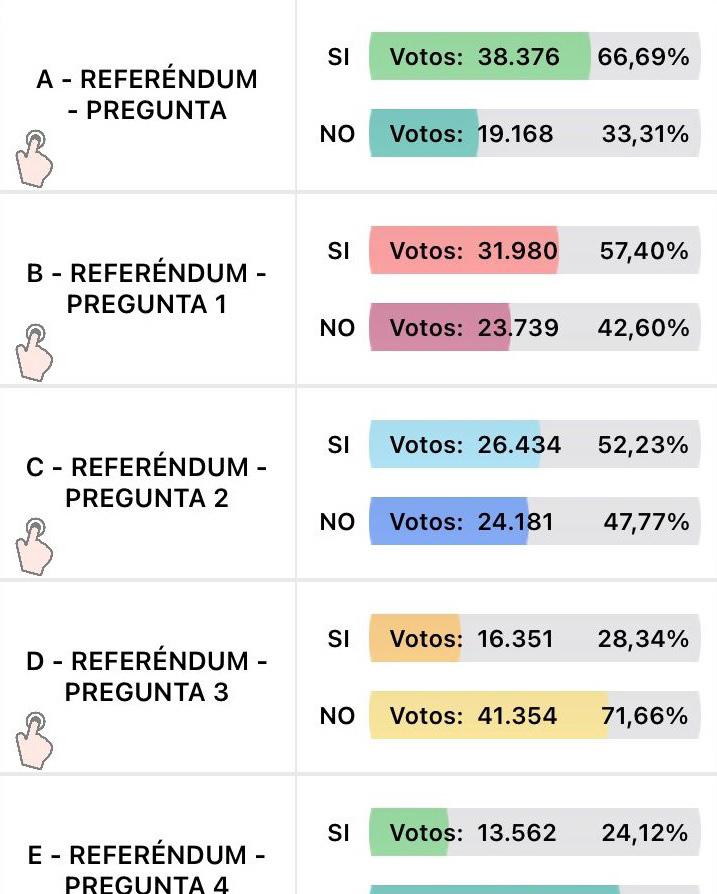 Las preguntas que no recibieron el favor popular son las relacionadas con el arbitraje internacional, y la posibilidad de reformar el Código de Trabajo para el contrato de trabajo por horas.