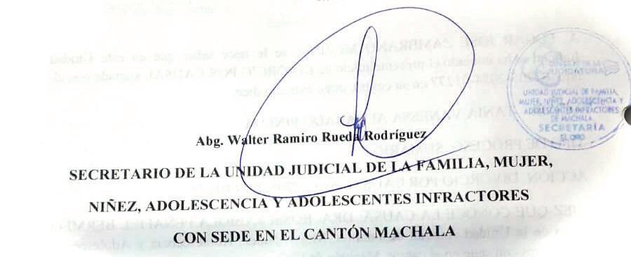 JUEZ QUE CONOCE LA CAUSA: DRA. ROSSI FABIOLA PEÑAFIEL BERMEO, Jueza de la Unidad Judicial de Familia, Mujer, Niñez, Adolescencia y Adolescentes Infractores con sede en el cantón Machala de El Oro.