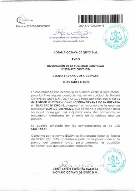 1. Mediante escritura pública otorgada el catorce de agosto del dos mil veinte y cuatro, ante mi Abogada Maria Lorena Ramos Villacreses, Notaria Vigésimo Primera del cantón Quito Suplente.