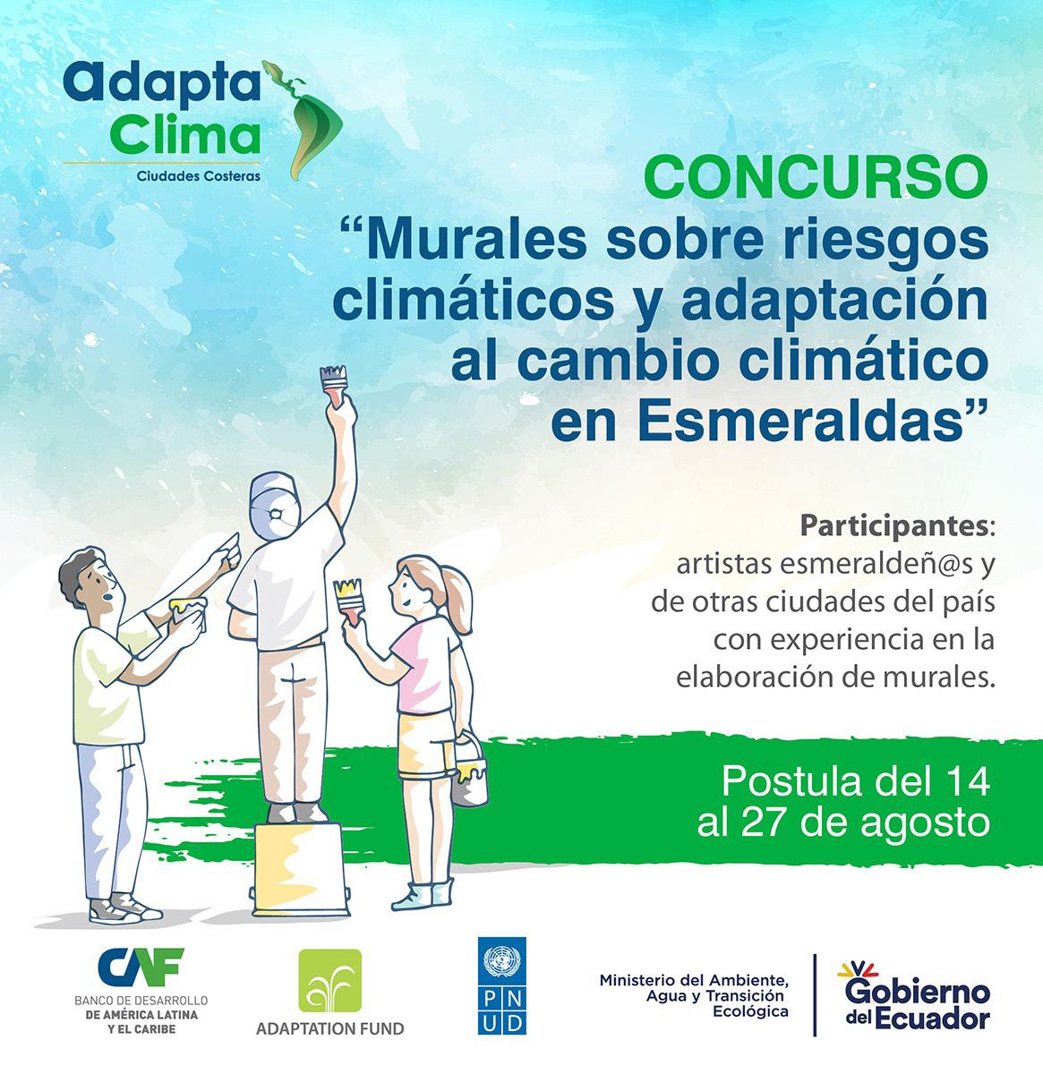 Coordinación del concurso Bajo la dirección de Verónica Ríos, coordinadora nacional del proyecto AdaptaClima, se desarrollará un concurso para sensibilizar y concientizar a la comunidad esmeraldeña sobre los efectos del cambio climático y las medidas de adaptación, así como los riesgos de origen climático a los que están expuestos, como las inundaciones y deslizamientos de tierra, a través del arte del muralismo.