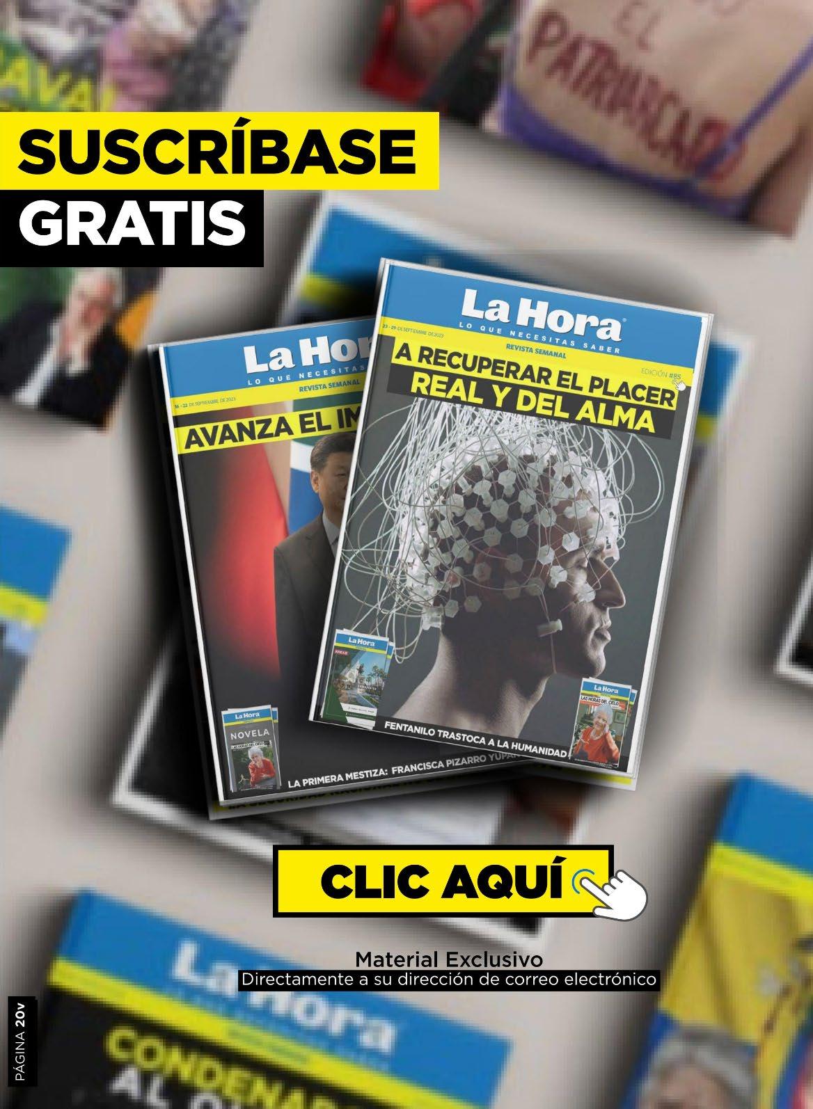de comunicación liberal, laico, agnóstico e inclusivo. Respetuoso y defensor de los Derechos Humanos, el Estado de Derecho y la Democracia. Directora Nacional Gabriela Vivanco Salvador Editor General: Jean Cano Editor Regional: Josué Navarrete Redacción: revistasemanal@lahora.com.ec Publicidad: fesmeraldas@lahora.com.ec Año: