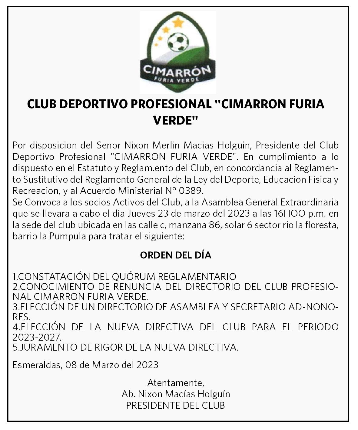 De conformidad con lo dispuesto en el Estatuto de la Empresa y en la pertinente Ley se convoca a los señores accionistas a la Junta General Ordinaria de la Compañía de Economía Mixta Zona de Apoyo Logístico de Esmeraldas ZALSA CEM, para el día Viernes 31 de Marzo de 2023, a las 16h00 en la sala de sesiones de la compañía, ubicada en la Av. Jaime Roldós -Vía al Puerto-, con el objeto de tratar los siguientes puntos: