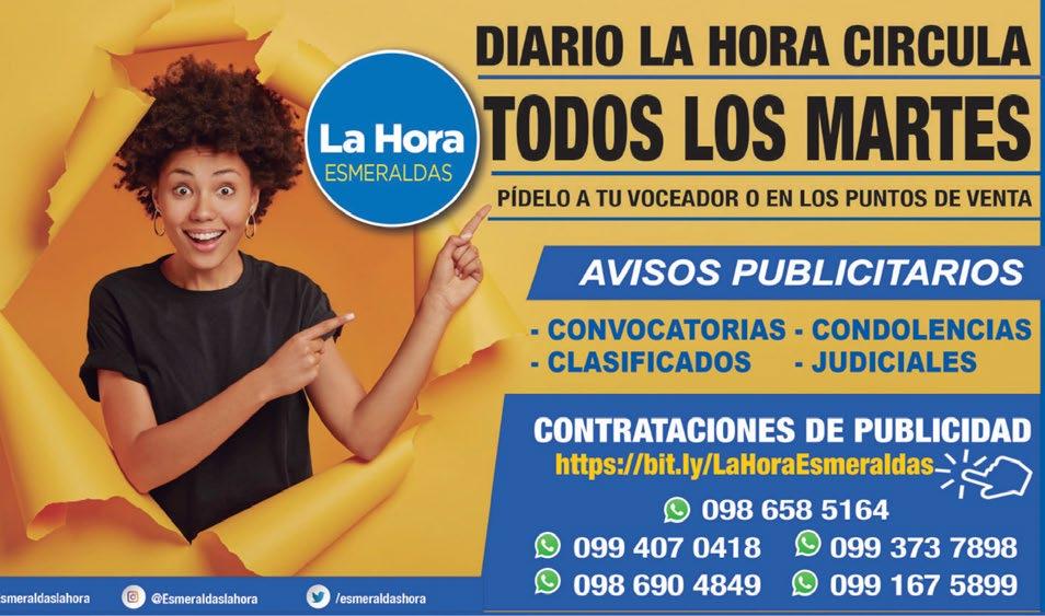 Medio de comunicación liberal, laico, agnóstico e inclusivo. Respetuoso y defensor de los Derechos Humanos, el Estado de Derecho y la Democracia. Directora Nacional Gabriela Vivanco Salvador Editor General: Jean Cano Editor Regional: Josué Navarrete Redacción: revistasemanal@lahora.com.ec Publicidad: fesmeraldas@lahora.com.ec Año: XXVIII No. 11754 Los escritos de los colaboradores solo comprometen a sus autores y no reflejan el pensamiento del medio, que se expresa en su Editorial. OPINIÓN 02 O ESMERALDAS LUNES 17/ABRIL/2023