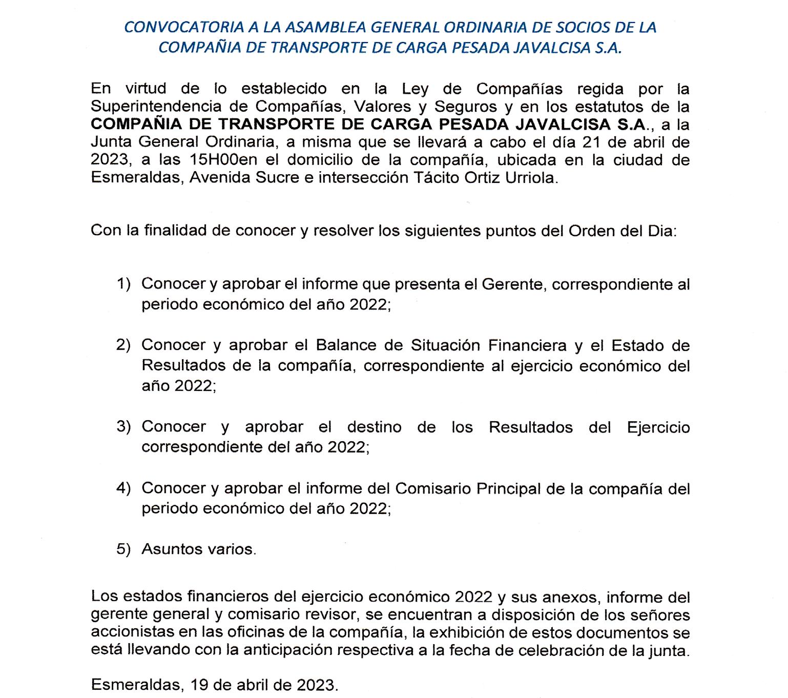 De acuerdo con la Ley de Compañías y el Estatuto vigente de la empresa, se convoca a los señores accionistas de la compañía LACTALIS DEL ECUADOR S.A., a la Junta General Ordinaria de Accionistas de la Compañía LACTALIS DEL ECUADOR S.A., la misma que de con la Ley de Compañías y el Estatuto vigente de la empresa, se celebrará el día jueves 27 de abril de 2023, a las 15h30, en las oficinas de la compañía, ubicadas en Av. Amazonas 10-14 y Av. Naciones Unidas, Edificio La Previsora, Oficina 501, en la ciudad de Quito, con el objeto de tratar los siguientes puntos: