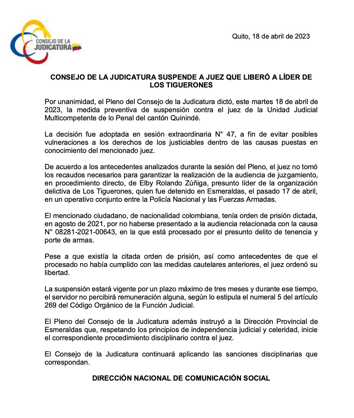Juez que dictó libertad para alias ‘Elbi’ es suspendido