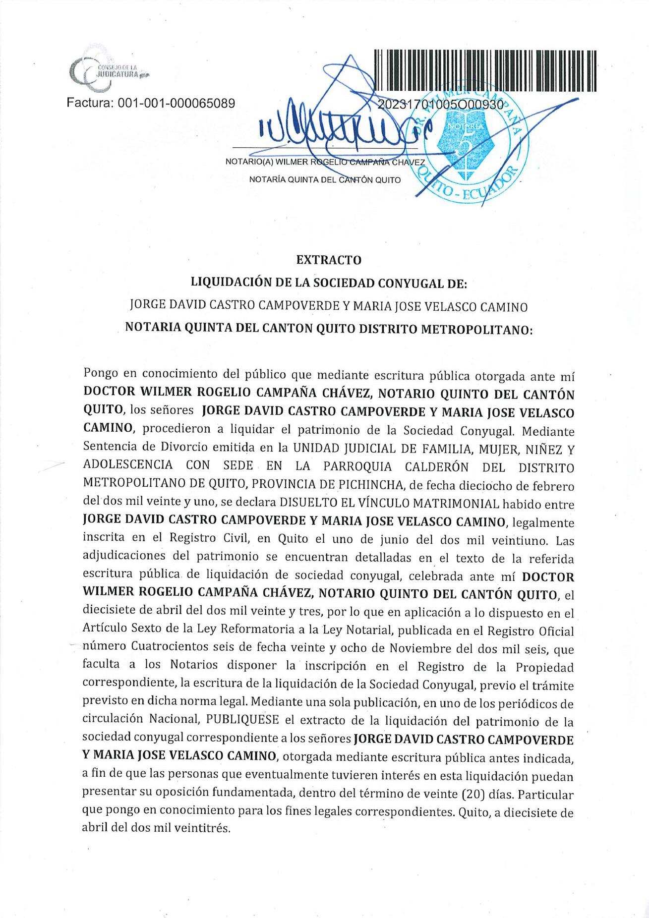 VELASCO CAMINO, otorgada mediante escritura pública antes indicada, a fin de que las personas que eventualmente tuvieren interés en esta liquidación puedan presentar su oposición fundamentada, dentro del término de veinte (20) días. Particular que pongo en conocimiento para los fines legales correspondientes. Quito, a diecisiete de abril del dos mil veintitrés