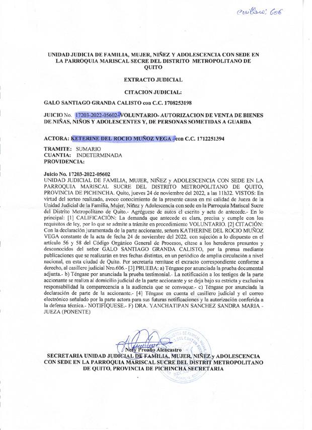 “…Tena, miércoles 30 de septiembre del 2022, a las 15h00. VISTOS: (…) En lo principal, conozco de la presente causa de Autorización de Venta de Bienes de Niñas, Niños, Adolescentes y de personas sujetas a guarda, en mi calidad de Juez de esta Unidad Judicial de Familia, Mujer, Niñez y Adolescencia con sede en el cantón Tulcán, en base al sorteo de ley.- I) La demanda presentada es clara, precisa y cumple con los requisitos legales previstos en los artículos 142 y 143 del Código Orgánico General de Procesos (COGEP), por lo que se califica y admite a trámite mediante procedimiento voluntario, conforme lo establece el inciso final del Art. 334 del mismo cuerpo legal invocado. Agréguese la documentación adjunta a la demanda, la cual se considerará en su momento procesal. II) CITACIÓN a HEREDEROS.- A los herederos CARRASCO GARCÍA NURY ALEXANDRA y CARRASCO GARCIA CRISTIAN OMAR se los citara de conformidad al artículo 53 y siguientes del Código Orgánico General de Procesos, mediante uno de los señores citadores de la Corte provincial de Justicia de Napo; a los Herederos Presuntos y desconocidos de la señora GARCIA VILLAGOMEZ INES MARÍA se los citará conforme el Art. 58 del Código Orgánico General de Procesos, a través de 3 publicaciones en el Diario “La Hora” con amplia circulación, que se edita en la ciudad de Quito, esto en armonía con el numeral 1 del artículo 56 del COGEP, para cuyo efecto la señorita secretaria de esta judicatura elaborará los extractos correspondientes, hecho lo cual y a partir de la fecha de la última publicación se procederá conforme indica la ley, respecto de la contestación a la demanda. III) El peticionario CARRASCO GAIBOR JAIME VICENTE, en su calidad de representante legal de la menor: ANABELY GISELL CARRASCO GARCÍA deberá comparecer en el día y hora de la Audiencia Única. En aplicación a los artículos 190 y 191 del Código Orgánico General de Procesos, en concordancia con el artículo 168 numeral 6 de la Constitución de la República del Ecuador, hágase saber del desarrollo de la diligencia de audiencia a los señores: TIXE BASATEZ MIRIAM ENITH y RODRIGUEZ BARRAGAN MARIA MATILDE sus declaraciones, se las receptará en el día de la Audiencia Única. En dicha audiencia se escuchará a los concurrentes y se practicará las pruebas que sean pertinentes. Téngase en cuenta la cuantía y el señalamiento de casillero judicial, el correo electrónico señalado, como la autorización que concede el peticionario a su abogado defensor Abg. Rodolfo Aguinda. Téngase en cuenta la documentación adjunta a la demanda. NOTIFÍQUESE.” Fdo) DR. CASANOVA