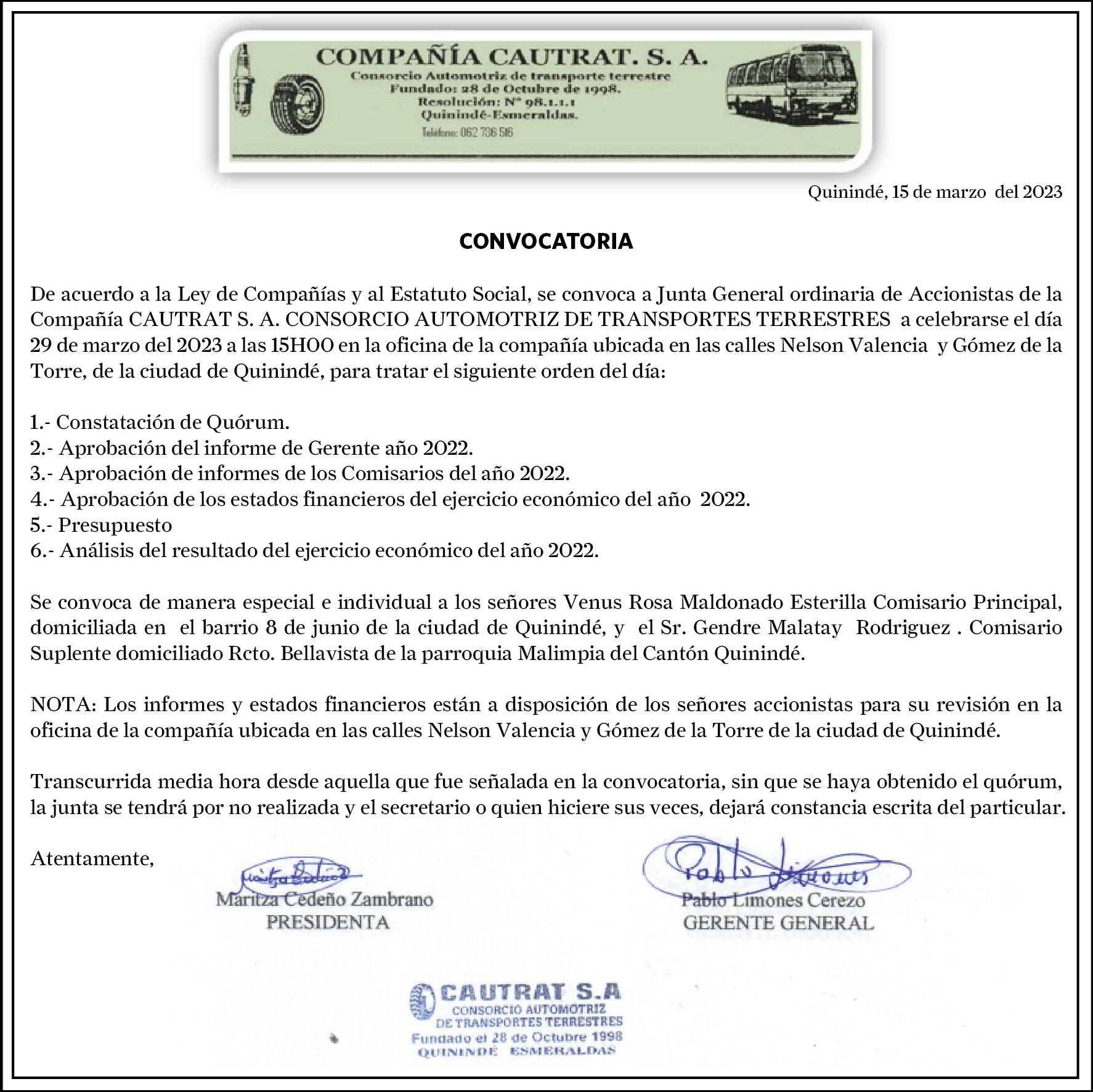 Se convoca de forma urgente y obligatoria a todos los señores Accionistas de BUSINESS WORLD LOGISTIC BWL S.A., a la reunión de Junta General Ordinaria de Accionistas a ser realizada el día miércoles 29 de marzo del 2023 a las 09h00 (Nueve de la mañana) en las oficinas de la empresa ubicada en la Av. Maldonado S9-455 y Gil Martín, para tratar el siguiente orden del día:
