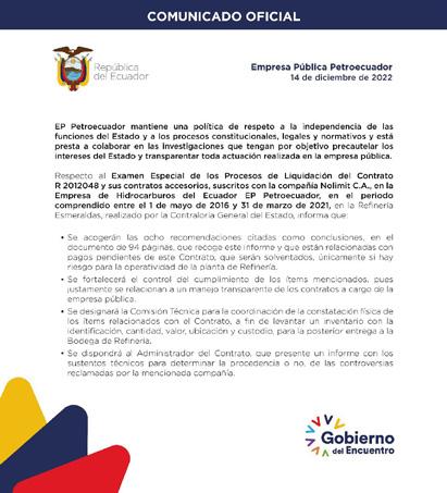 La máxima institución de de control fiscal del estado Ecuatoriano tras una investigación determinó seis responsabilidades civiles culposas contra funcionarios de Petroecuador y la empresa contratista Nolimit C.A en el periodo entre 2016 y 2021 de la refinería de Esmeraldas bajo el concepto de ‘Trabajos de modernización de la Refinería’.