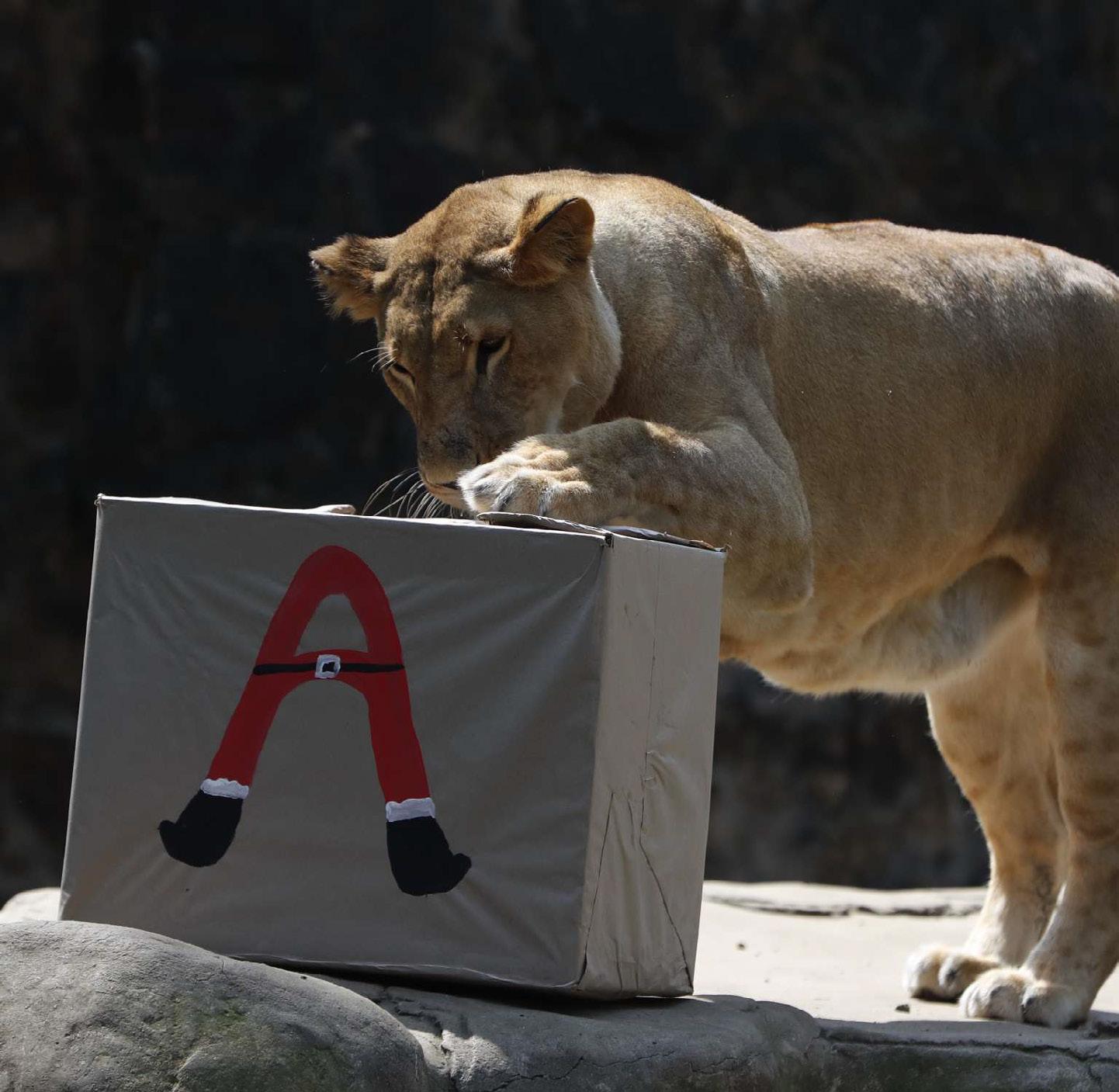 Una leona rompe una caja de regalo hoy en el zoológico de Cali (Colombia). Promotores de bienestar animal le dieron una dulce navidad a varios animales del zoológico con cajas adornadas como regalos donde les ofrecieron los alimentos que más disfrutan. EFE